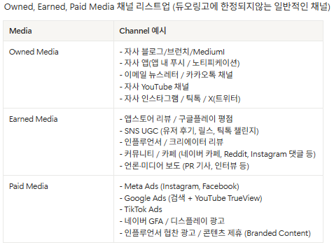 1) 온드/언드/페이드 미디어 채널 리스트업